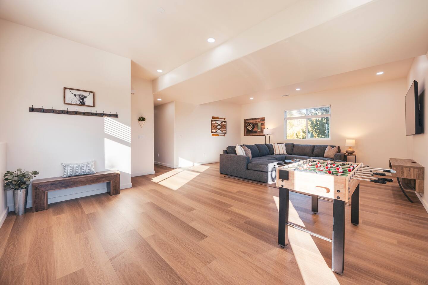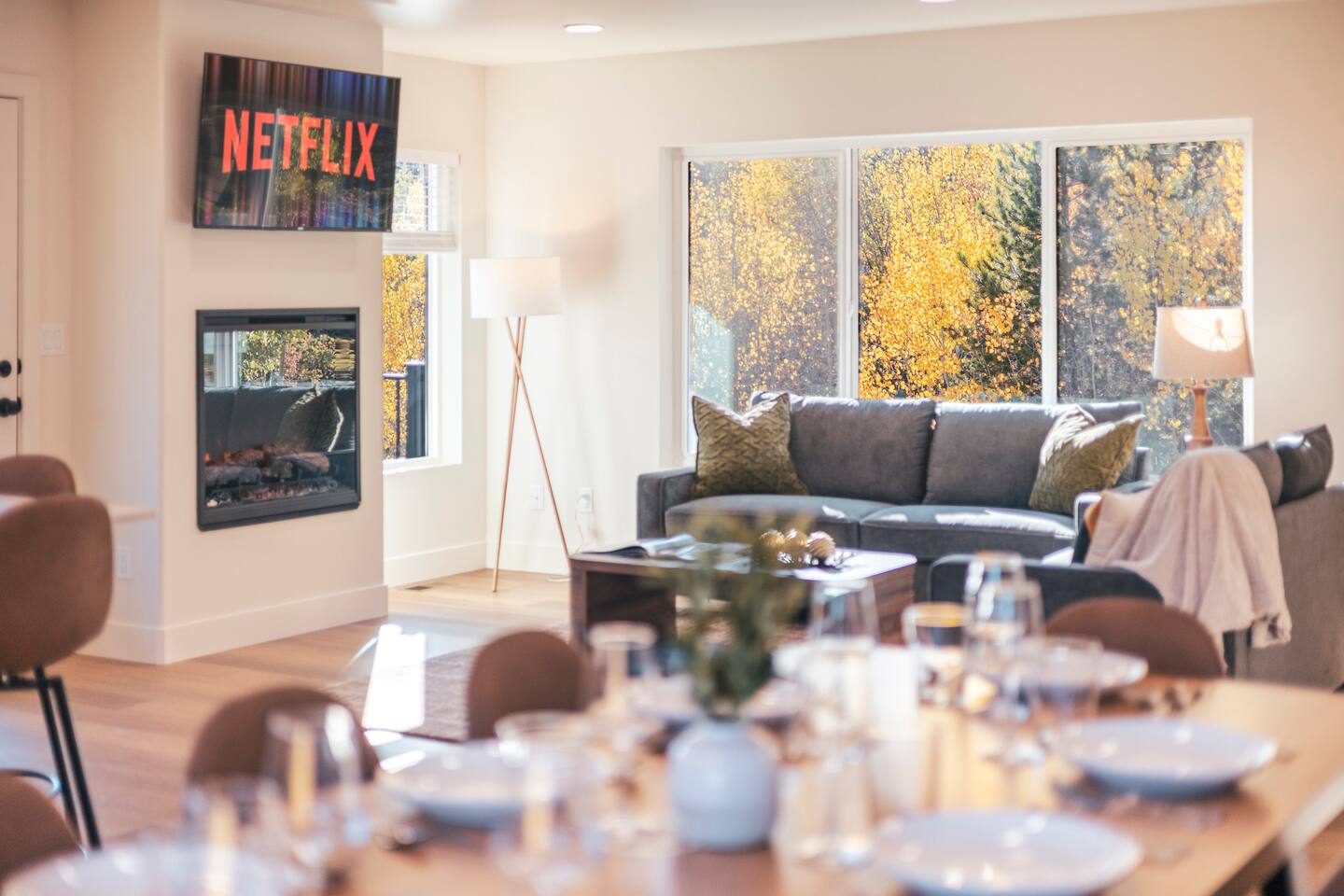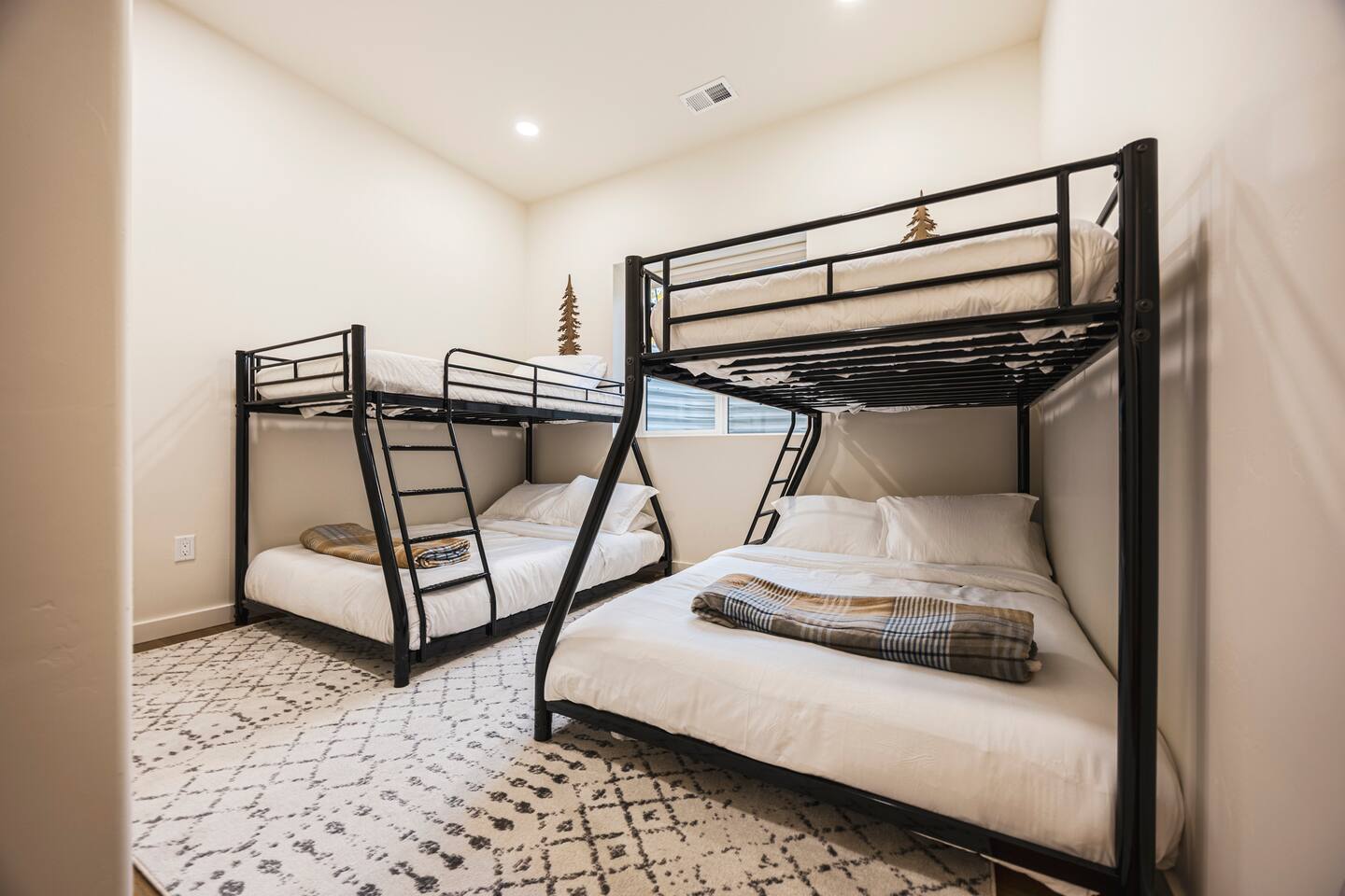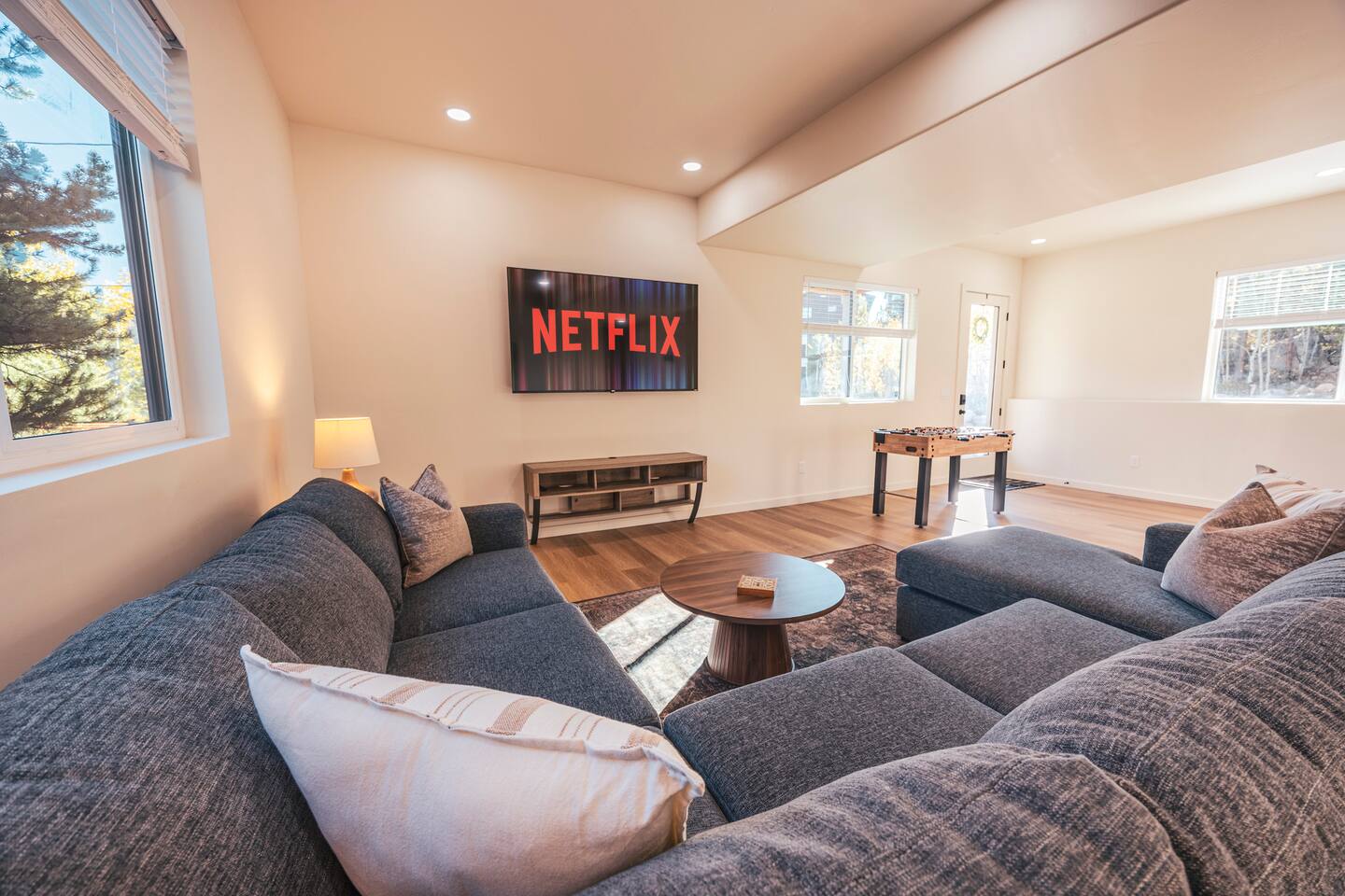 Designed for comfort and connection, this modern mountain retreat features clean lines, natural textures, and thoughtful details throughout. With four spacious bedrooms and three full bathrooms, everyone in your group will have room to unwind and enjoy the views from every window. Living Areas: Cozy up around the fireplace for movie night in the upstairs living room or head downstairs to the family room for foosball, darts or to catch your favorite game on the 75 inch TV. Kitchen & Dining: The fully equipped kitchen includes modern appliances and cookware. A large dining table offers plenty of space to share meals and memories. Outdoor Living: Step out onto the expansive deck to enjoy morning coffee, stargazing, or mountain sunsets around the fire pit. The space is perfect for outdoor dining and taking in Grand Lake’s iconic fireworks displays on holidays throughout the year. Kid-Friendly Comforts: Families will appreciate the bunk beds, books, toys, and kitchen essentials for little ones. A Pack ’n Play and travel bassinet are available upon request. Amenities for a Seamless Stay: ✔️ Smart TVs & fast Wi-Fi ✔️ New All-in-one washer/dryer ✔️ Blackout shades in every bedroom ✔️ Gas grill & outdoor fire pit ✔️ Indoor Electric fireplace ✔️ Foosball & darts ✔️ 75 inch Smart TV in family room Location: Two miles from Rocky Mountain National Park’s western entrance and a short drive to Granby Ranch (20 min) or Winter Park Resort (40 min), this home makes it easy to enjoy year-round adventure without the hustle and bustle of I-70 crowds. Distance from Denver International Airport (DIA): 120 miles / approx. 2 hr. 20 minute drive Whether you’re cozying up after a day of adventure or sipping wine on the deck overlooking the lake, this retreat offers the perfect balance of modern comfort and mountain serenity. Come make lasting memories at The Aspen Echo where mountain charm meets modern comfort.